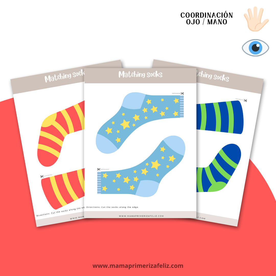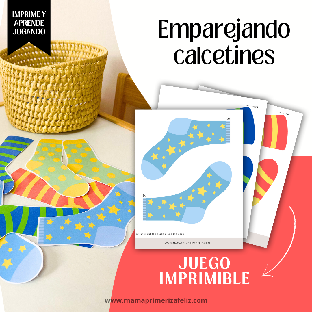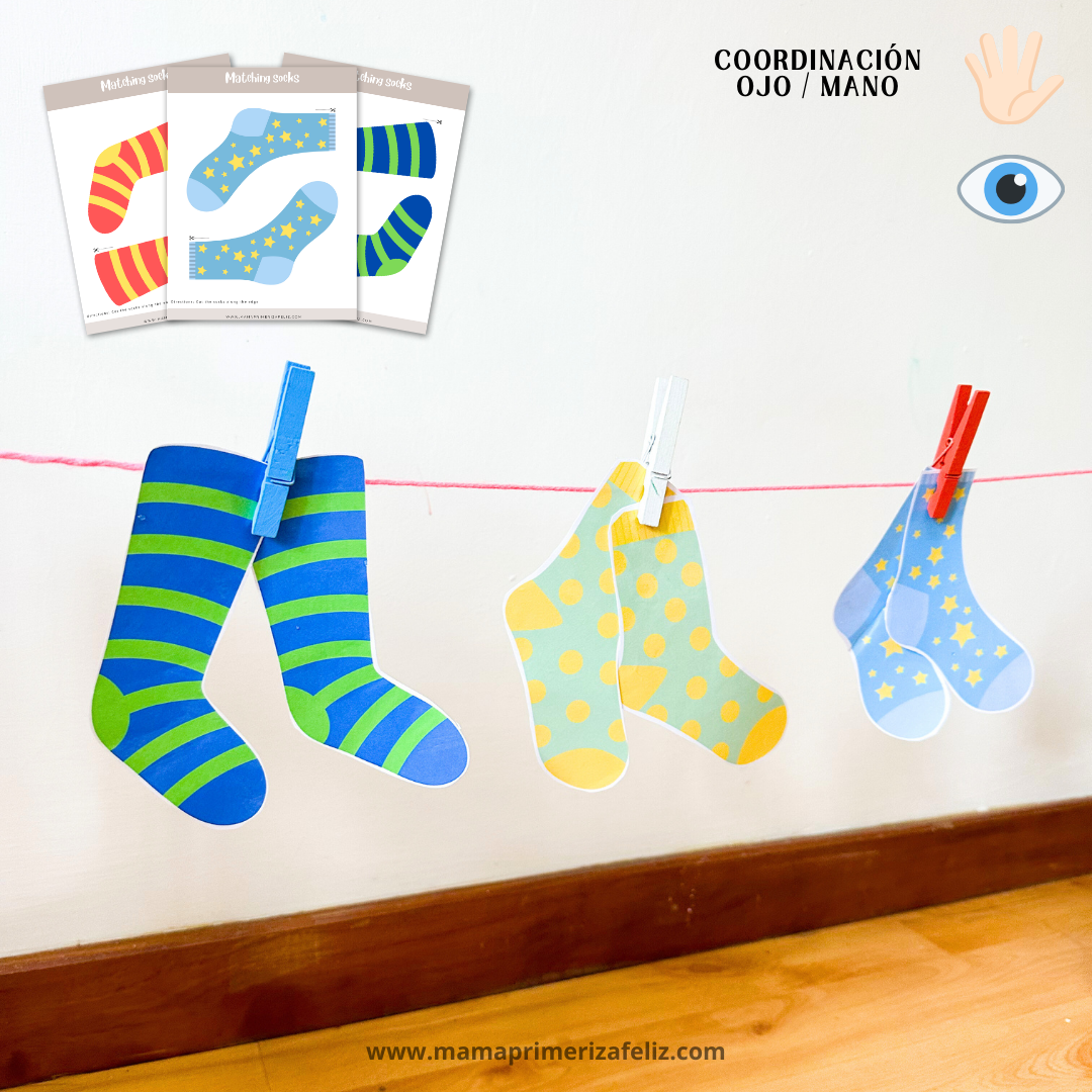 El juego montessori Emparejando Calcetines refuerza la habilidad del emparejamiento de patrones relacionados a colores y formas, contribuye al desarrollo de la memoria y las habilidades de combinación volteando los calcetines y haciendo que el niño combine cada par.
